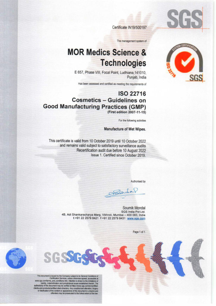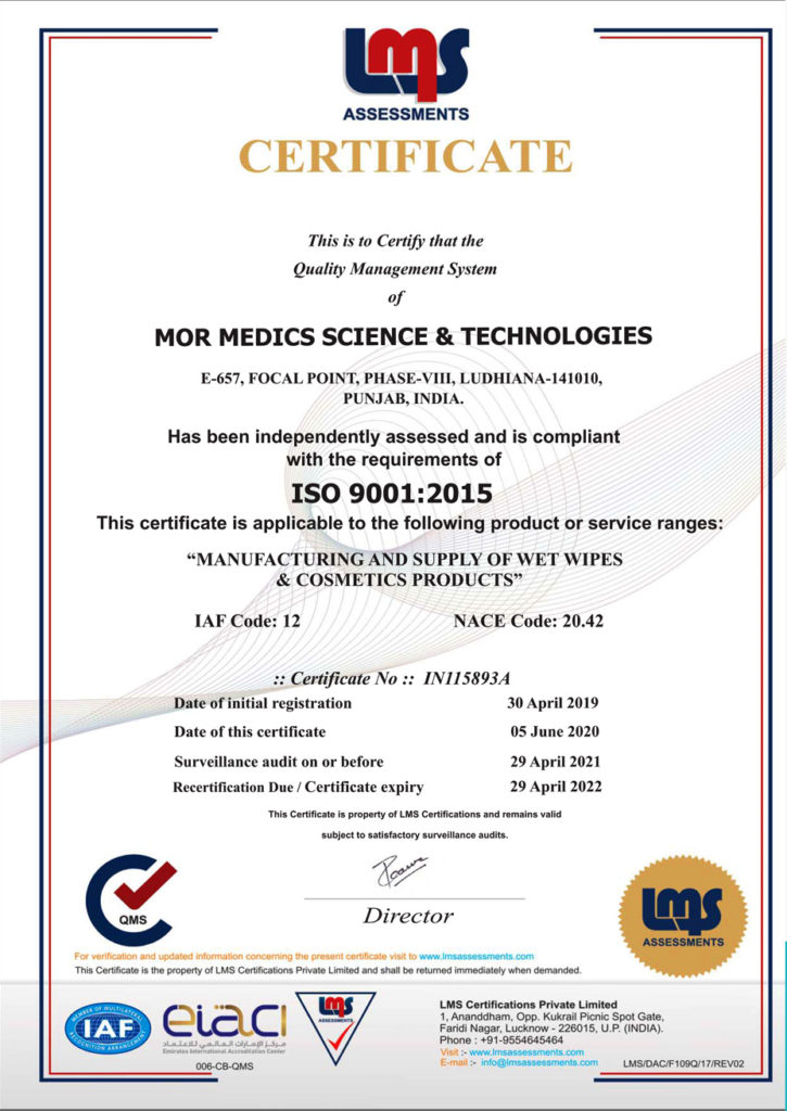 “Adios, India’s premier manufacturer of Wet Wipes. The core business strategy of Adios lies in building a World Class manufacturing & systems. Adios is proud to state that it has probably the best Wet Wipes manufacturing facility in Indian subcontinent, in terms of hygiene and meeting the global wet wipe packaging norms. Adios is ISO 22716 certified company, approved by FDA with in-house microbiological & analytical testing labs.